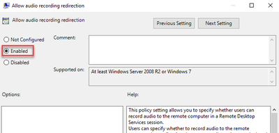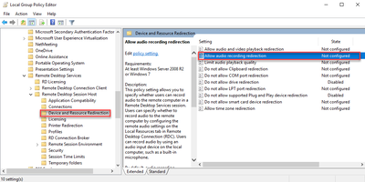2. Office PC and server: activate “Allow audio recording redirection” in Local Group Policy