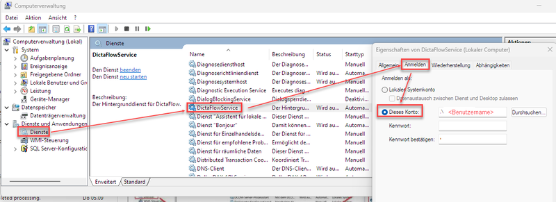 - Den DictaFlow-Dienst vom lokalem System Account auf einen Benutzer umstellen