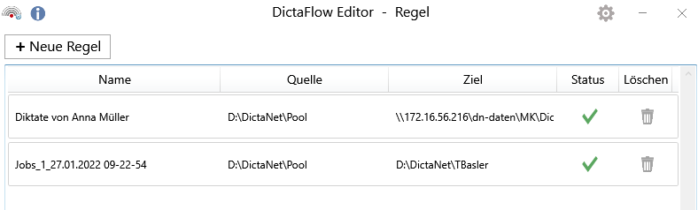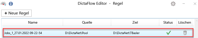 Im DictaFlow Editor kann man die Regeln erstellen, nach denen Diktate von einem Diktatordner Quelle in einen anderen Diktatordner Ziel übertragen werden.