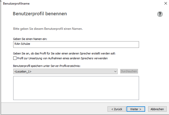 Möchten Sie für einen anderen Sprecher ein Profil anlegen, dann aktivieren Sie zusätzlich die Einstellung „Profil zur Umsetzung von Aufnahmen eines anderen Sprechers verwenden‘“.